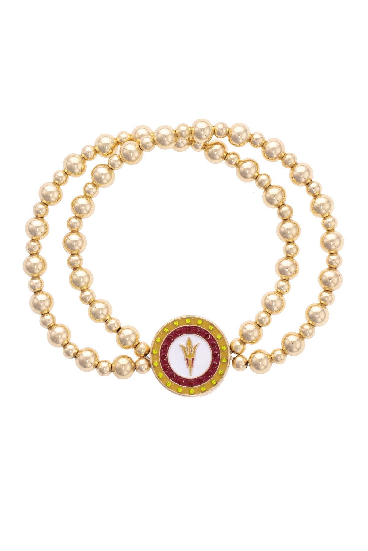 The Arizona State Sun Devils Pavé Disc 2-Row Ball Bead Stretch Bracelet in Shiny Gold adds a sparkling touch of team pride with its glittering pavé disc centerpiece and sleek double row of shiny-gold beads. Its easy stretch fit makes it a stylish, comfortable way to support ASU on game day and beyond.