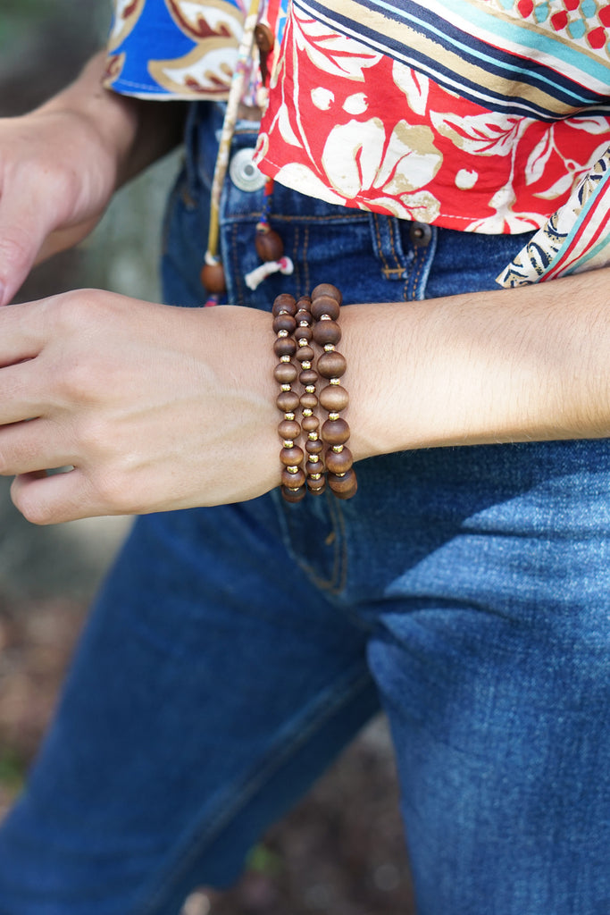 This trio of stretch bracelets blends natural wood beads with laid-back sophistication — perfect for stacking.