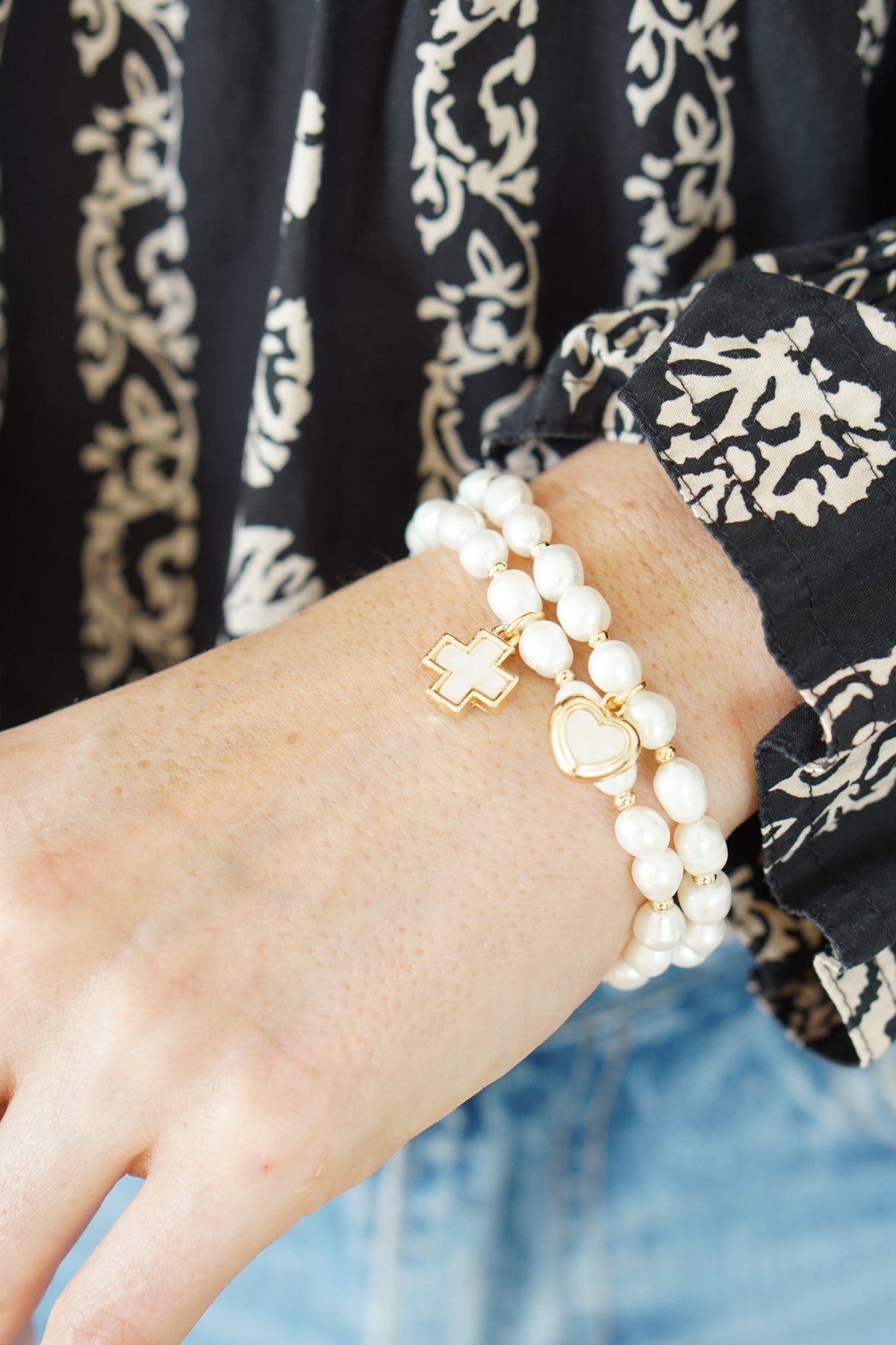 This set of two stretch bracelets features classic ivory pearls and gold accents for a look that’s both refined and versatile. Stack them together or mix with other favorites for effortless elegance.