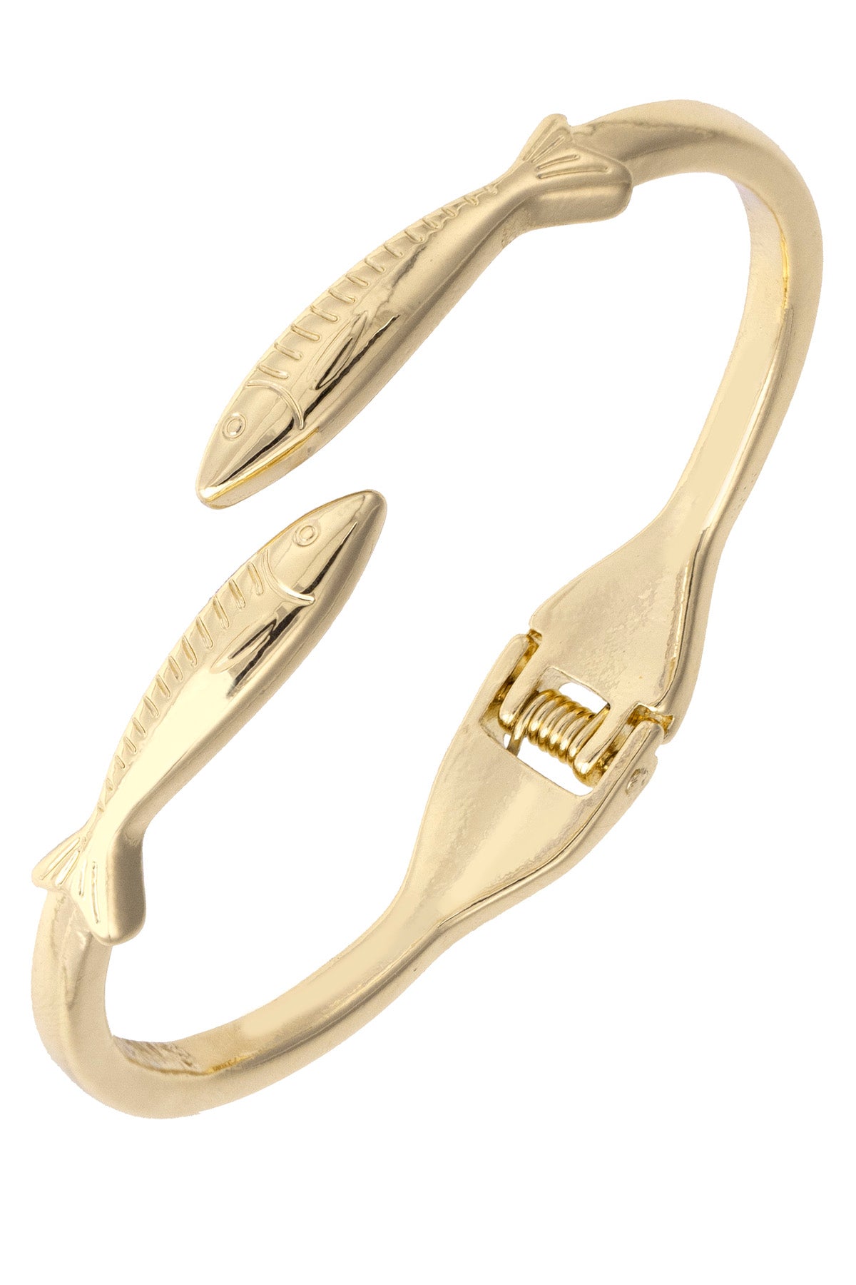 This shiny gold bangle features a sardine motif for a unique, coastal-inspired touch. Perfect for stacking with your favorite bracelets.