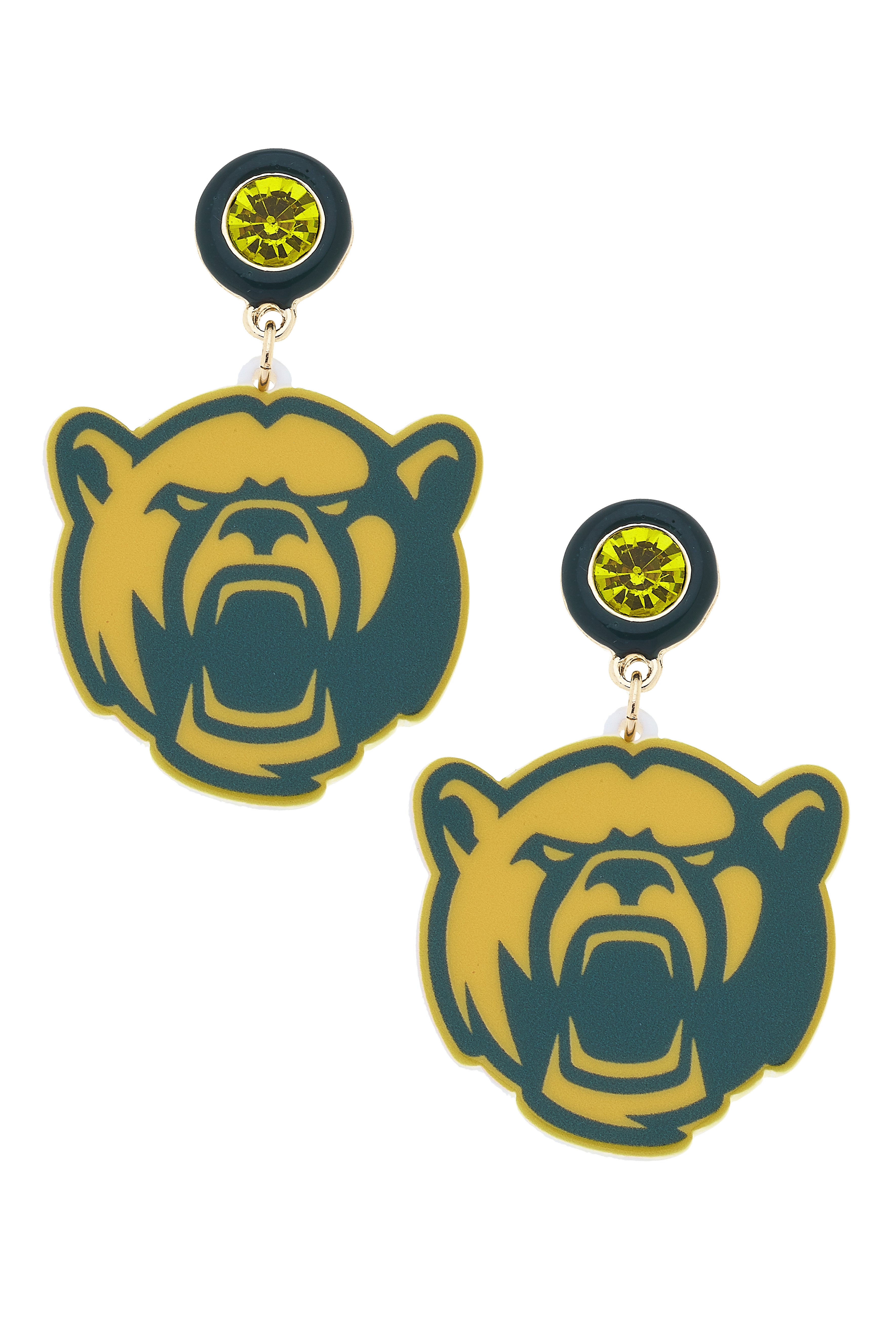 PREORDER 12/10:Baylor Bruiser Bear Resin Mascot Earrings in Green/Gold
