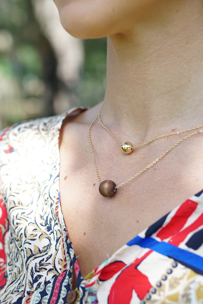 Double the style, double the shine — this two-row gold wood bead necklace is a statement in modern prep.