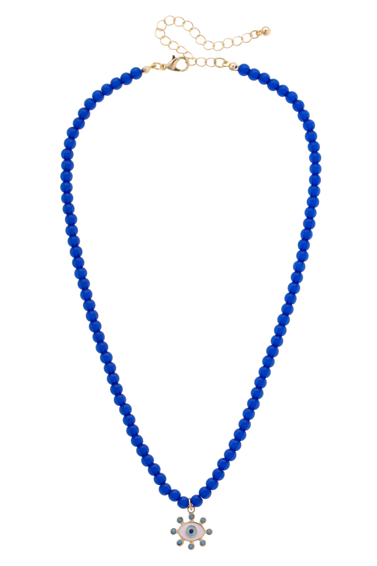 Blue beads with an evil eye charm bring a playful, beachy feel to this necklace. Perfect for layering with gold chains or wearing solo.