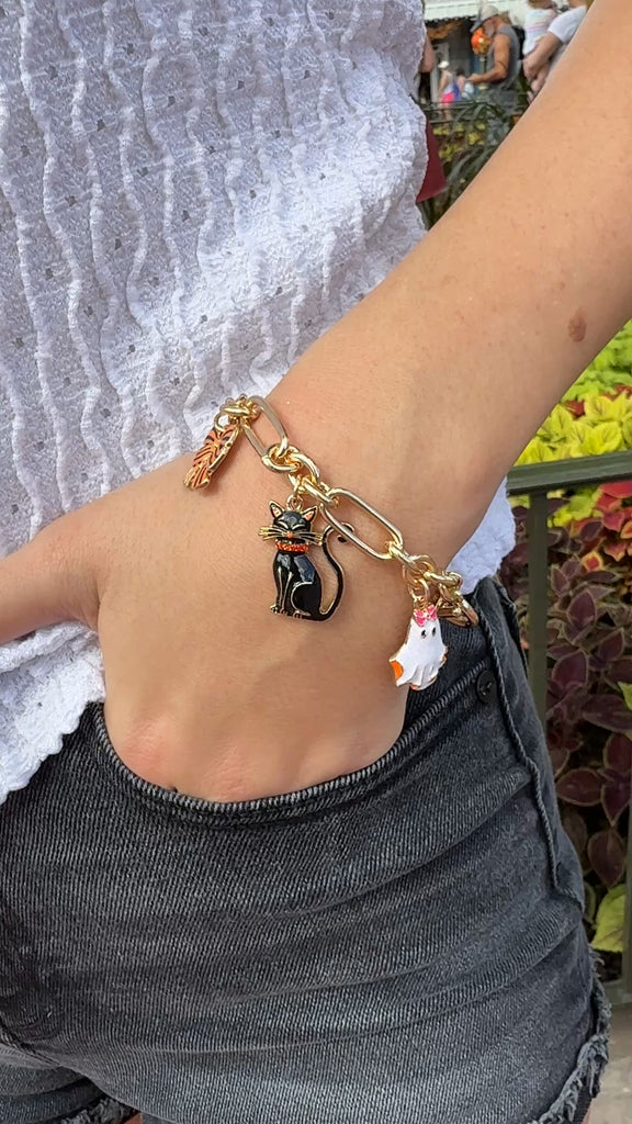 Celebrate Halloween in color with this shiny gold bracelet featuring a playful mix of enamel charms.