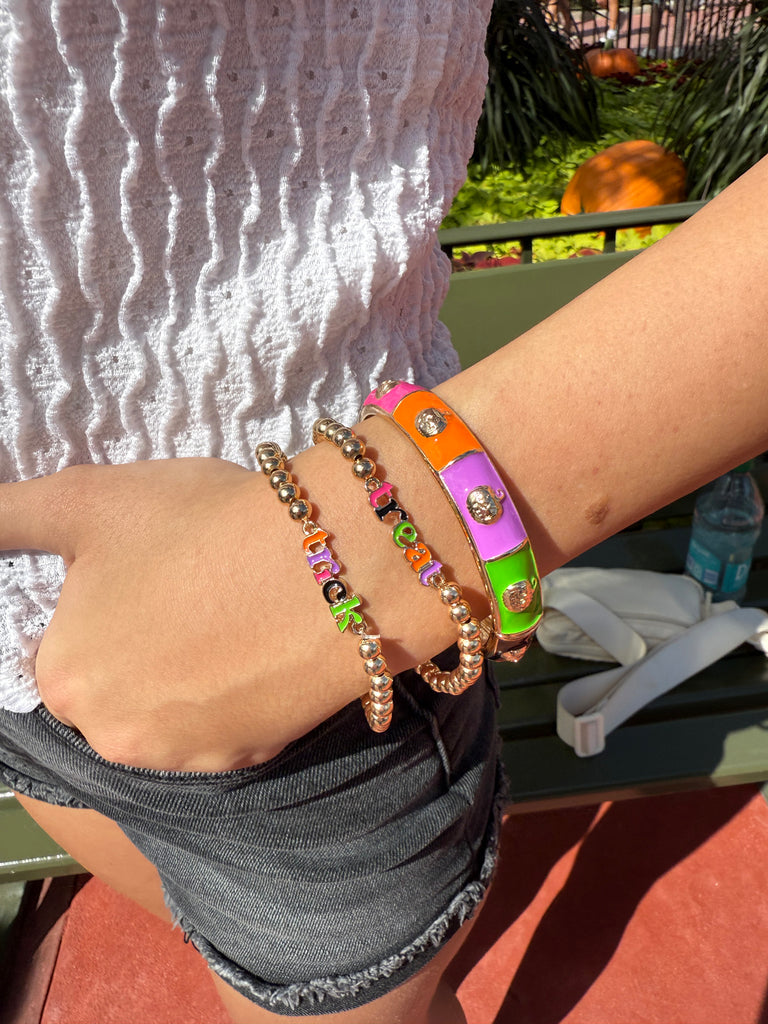 Celebrate spooky season in color with this multi-hue pumpkin-themed bangle, pure party on your wrist.