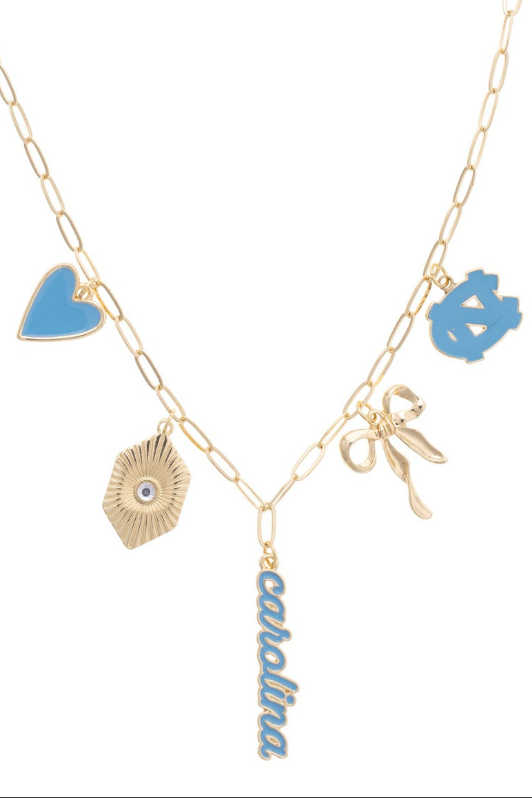 This North Carolina Tarheels Paper Clip Charm Collector Necklace is a modern and stylish way to show off your school pride. The shiny gold paperclip chain holds a variety of team-inspired charms, making it a versatile and preppy addition to your jewelry collection.