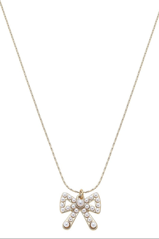 A sweet bow motif encrusted in tiny ivory pearls strung on a delicate chain. This necklace is cute meets couture - charming for day to evening wear with a whimsical, feminine appeal.