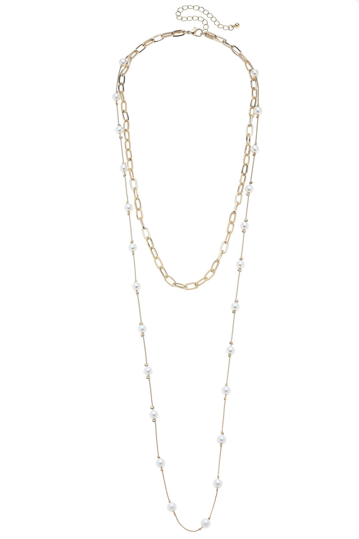 A sleek two-tiered chain necklace finished in polished shiny gold, perfect for layering effortlessly. A minimalist statement piece that shines on its own or pairs beautifully with other pearl pendants for added texture and luxe warmth.