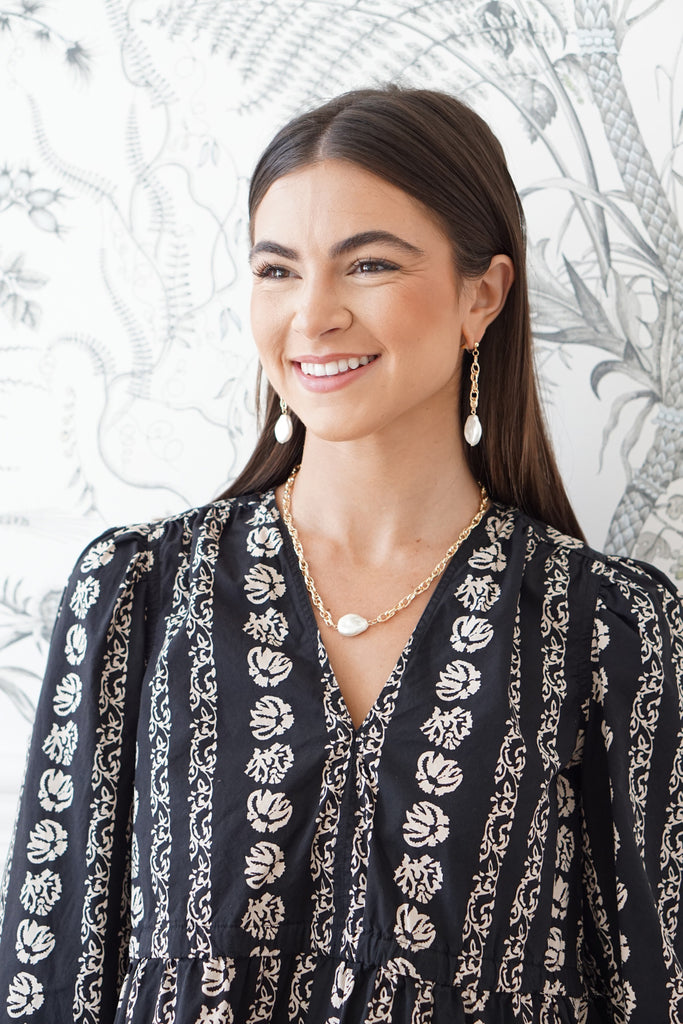 Matching drop earrings that echo the necklace, baroque pearls and gold links dangle in sculptural alignment. Perfect to amplify any look with edgy elegance.