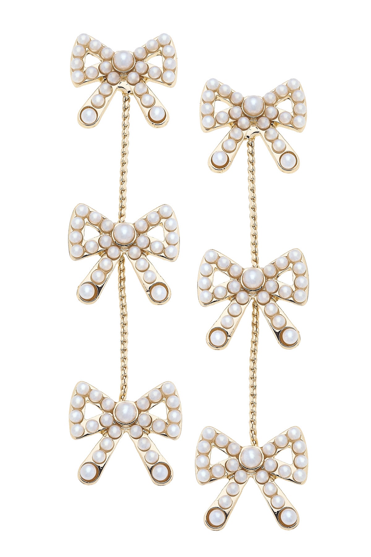 These elegant drop earrings feature linked pearl-studded bows, cascading softly for movement and shine. A whimsical update to classic drop earrings, perfect for special events or dressy attire.